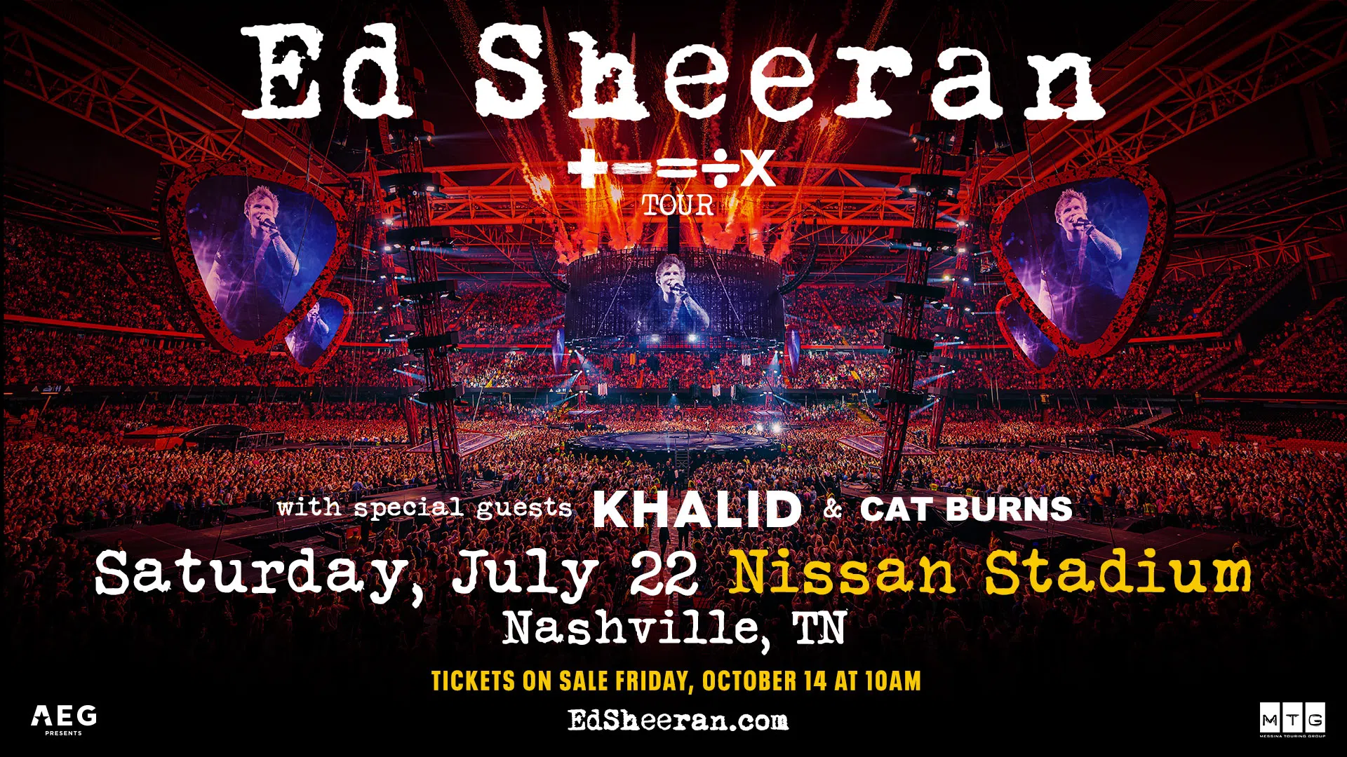 Ed Sheeran is coming to Nissan Stadium on July 22 on The Mathematics Tour, featuring special guests Khalid and Cat Burns! Check out all the details and purchase tickets starting October 14 at 10am.