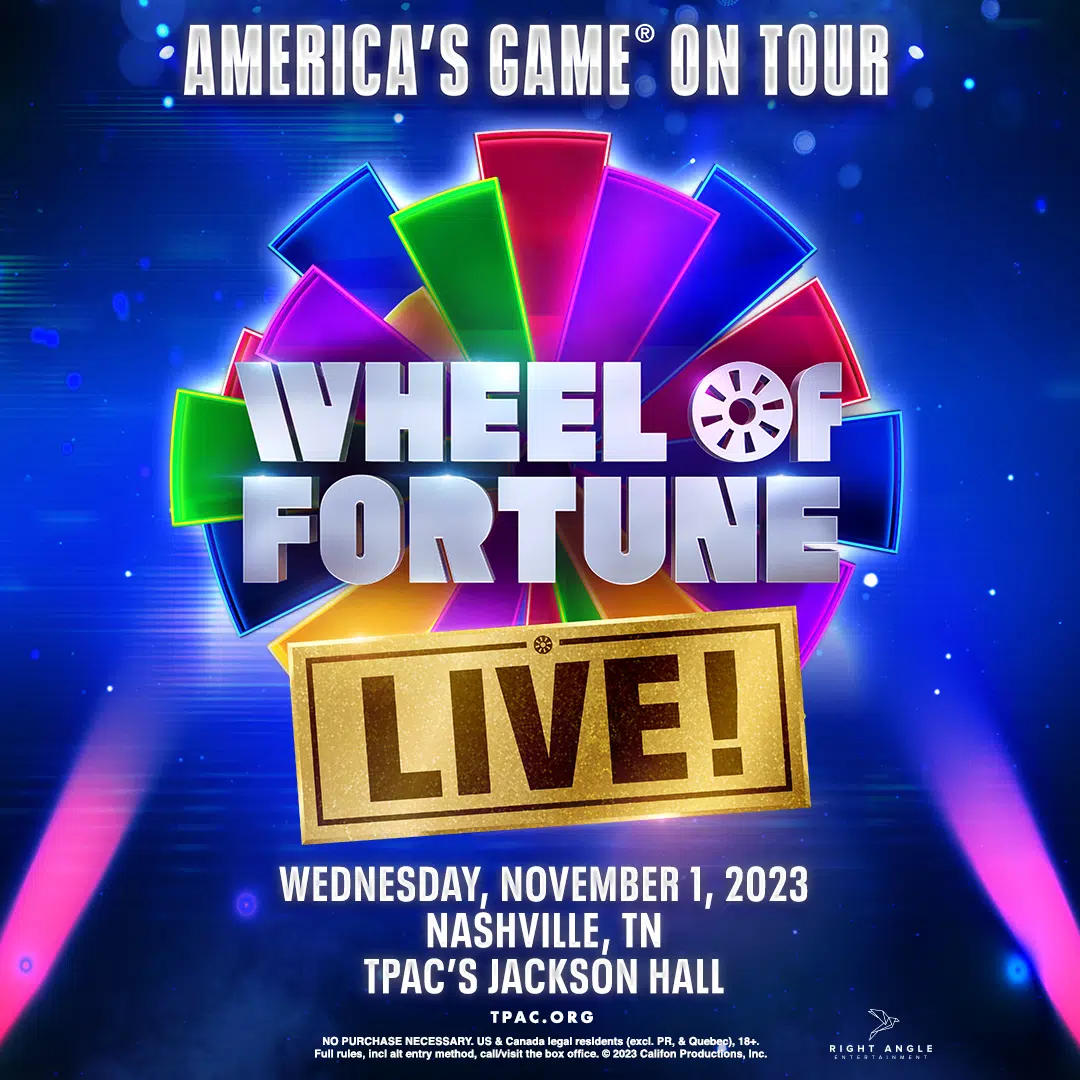 One of the greatest game shows of all time is coming to Nashville! Wheel of Fortune LIVE! lights up the stage at Andrew Jackson Hall on November 1st, and everyone has a chance to get in on the fun and WIN! Guests will be randomly selected to go on stage, spin the wheel and win prizes, including trips to destinations like Paris or Hawaii, or up to $10,000 in cash!! Find more details and purchase your tickets HERE!