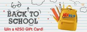 The kids are getting ready to head back to class, and we know this time of year can get expensive! That's why Mix 92.9 is helping you get through Back to School shopping with a $250 Visa gift card! Congrats to: Ashley W. - Nashville Heather S. - Hendersonville
